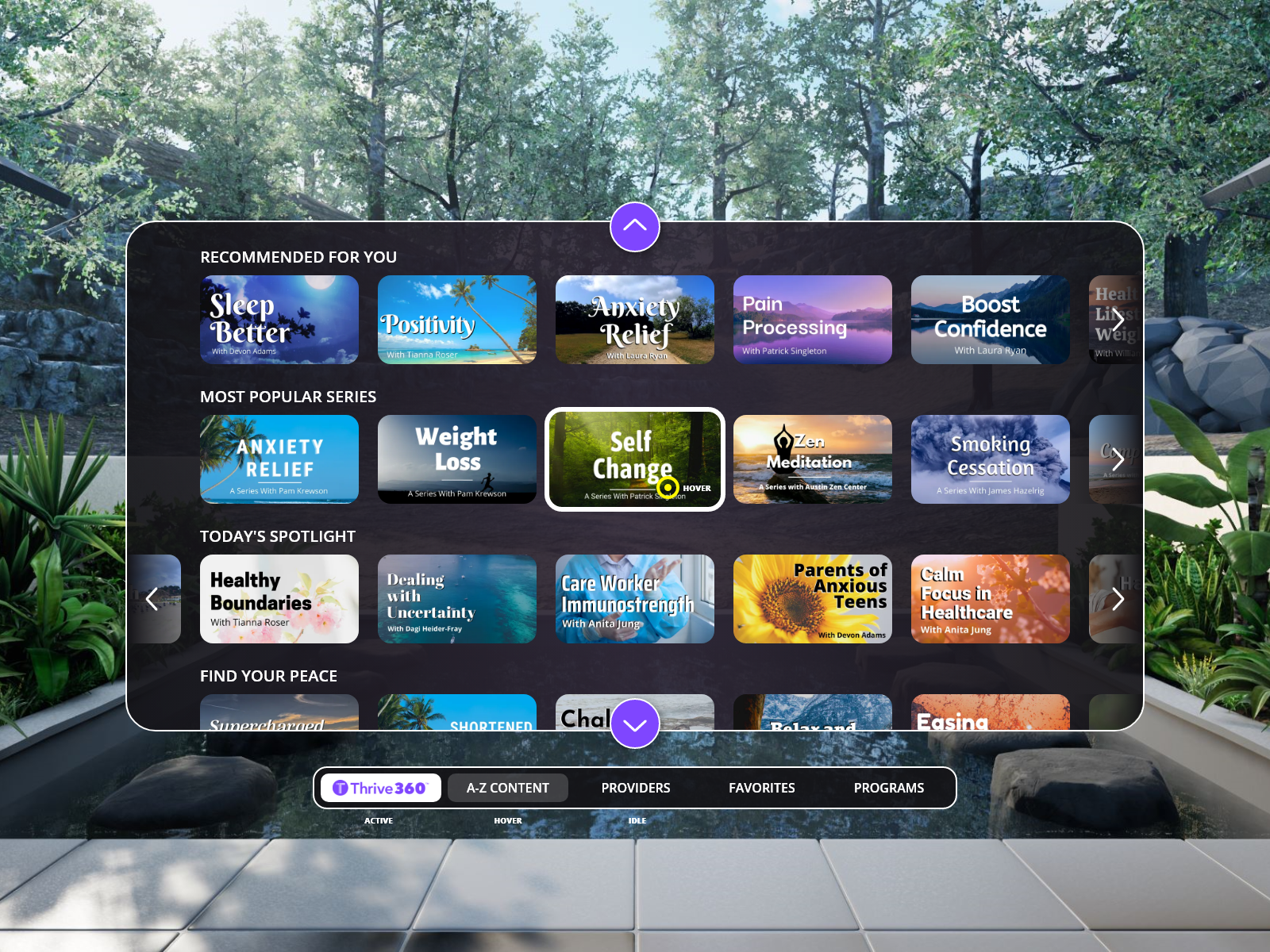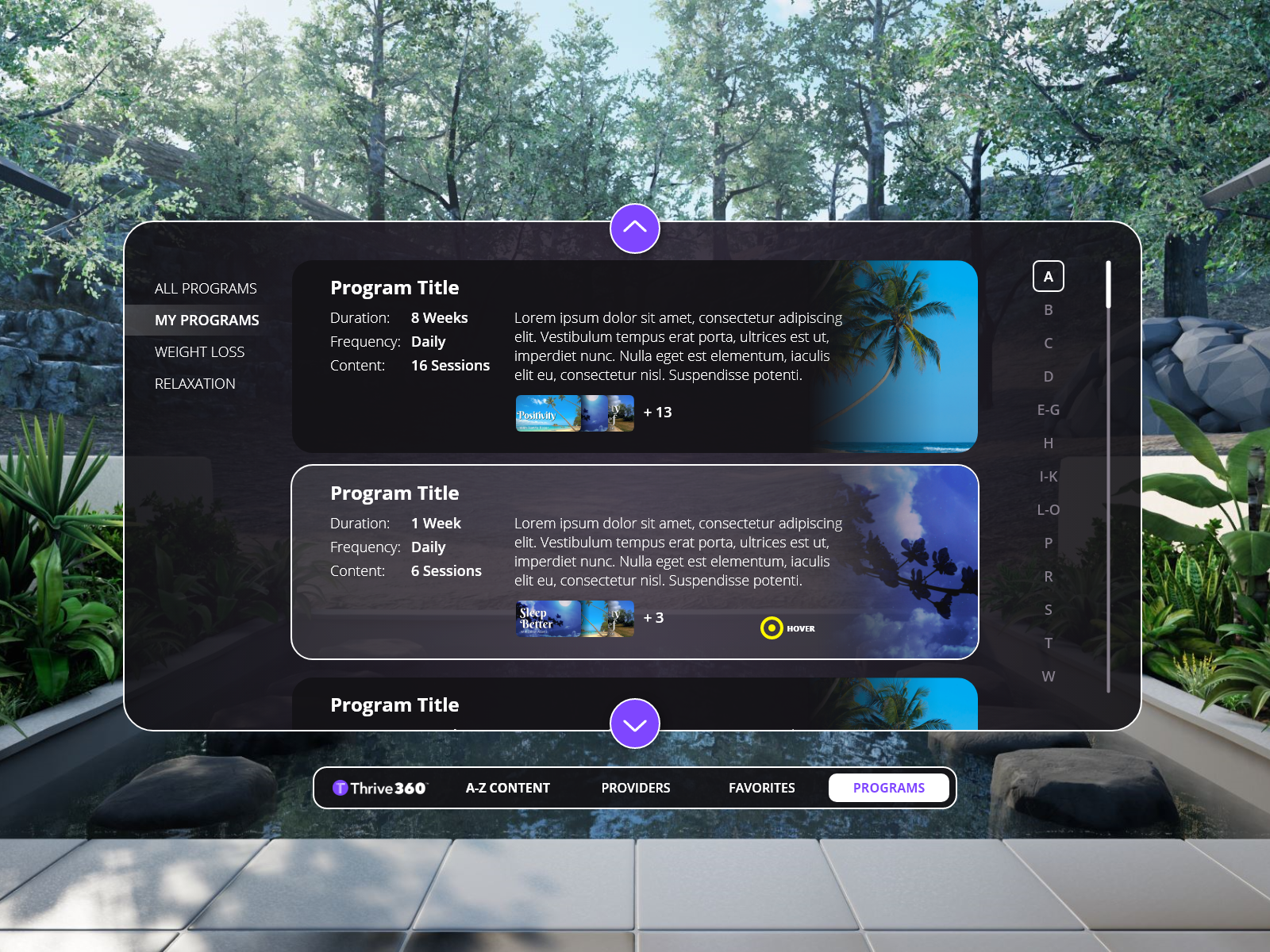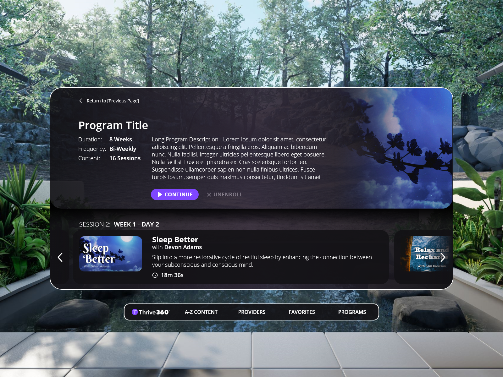 1. Thrive360 was founded as a VR first platform that would be used in offices as a wellness benefit made available to employees. The original designs were built to take advantage of VR’s immersion with 3 panels that enveloped the user.