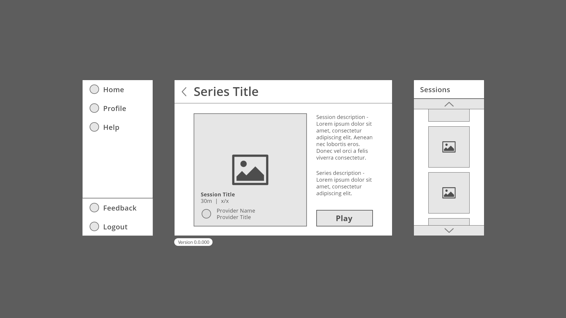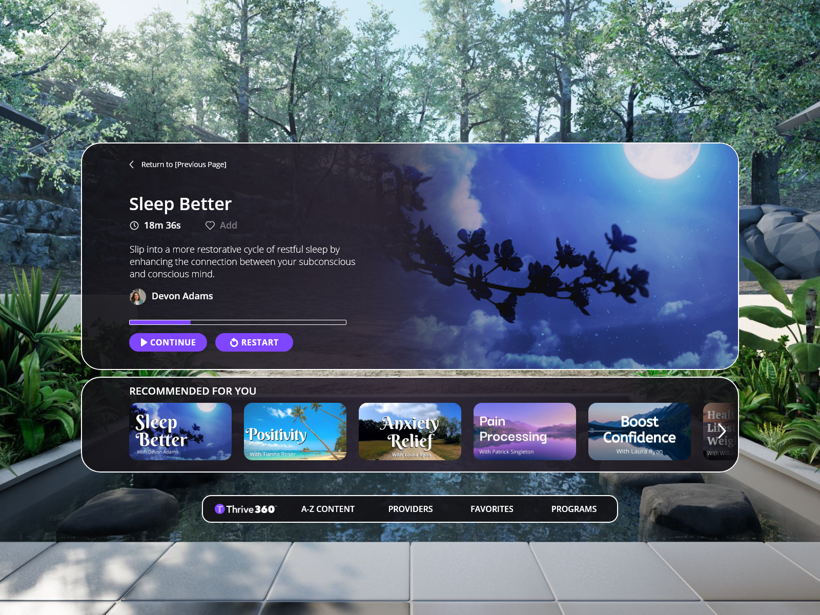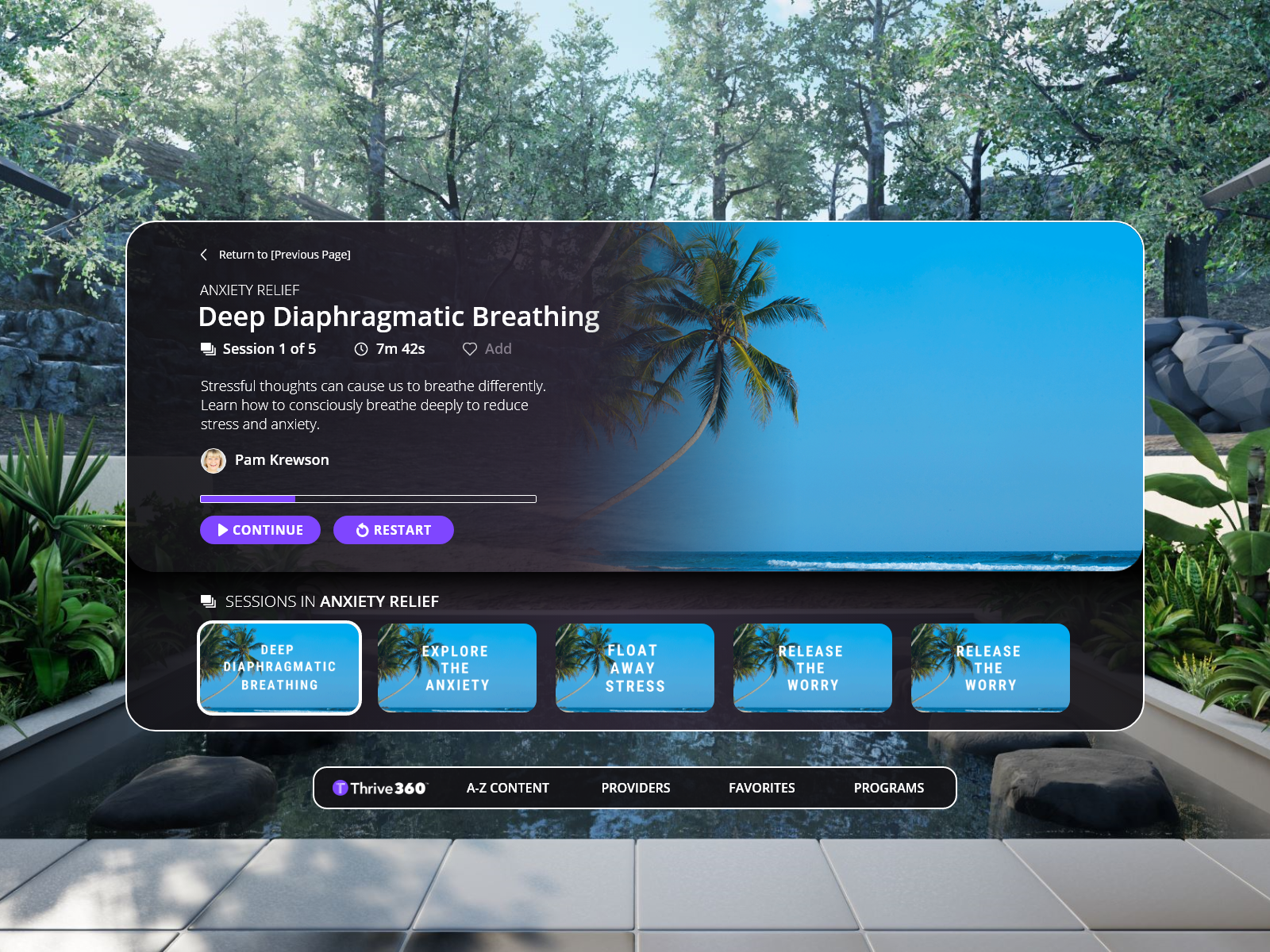 1. Thrive360 was founded as a VR first platform that would be used in offices as a wellness benefit made available to employees. The original designs were built to take advantage of VR’s immersion with 3 panels that enveloped the user.